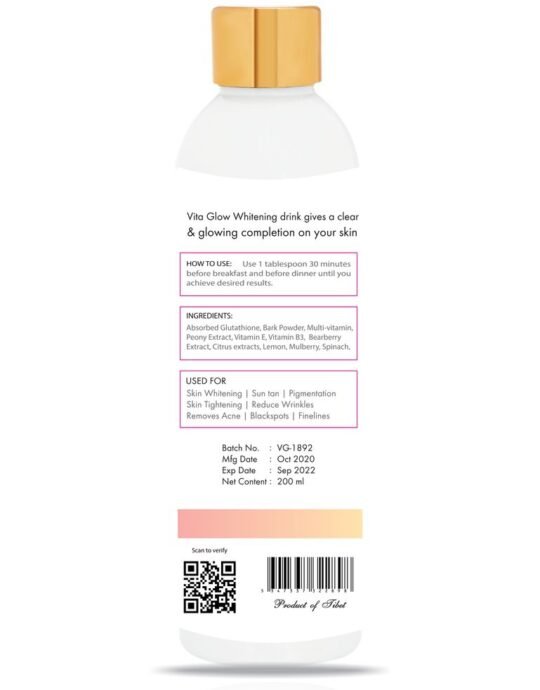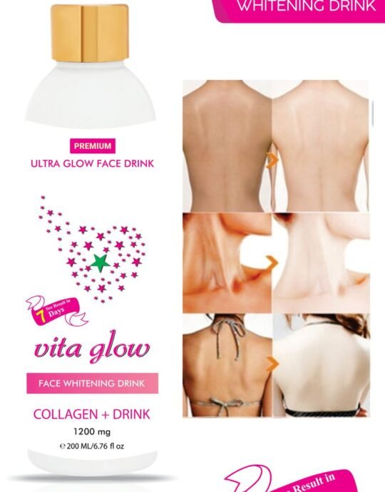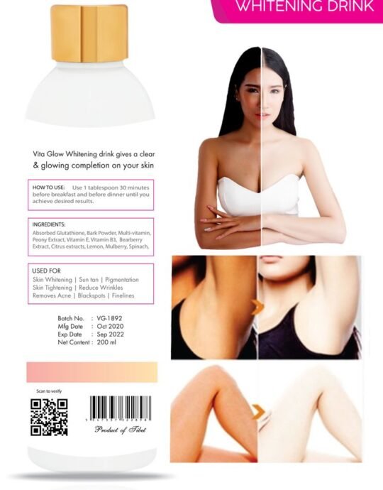 Vita Glow skin Whitening drink leaves your skin clearer, brighter and younger. Your GO-TO product for Radiant and Youthful skin! It has potent antioxidants that naturally helps to strengthen your skin and repel unwanted damages. VA and UVB rays. It has potent antioxidants that naturally helps to strengthen your skin and repel unwanted damages. You can also add a few drops of this serum with sunscreen. Exfoliates and Brightens Skin: This drink helps your skin look younger for longer by stimulating collagen production and by evening out your skin tone and brightening your complexion simultaneously. Strong concentration of these vitamins leaves the skin looking, feeling replenished and revitalized. Anti-Ageing: Age causes us to lose collagen, leading to wrinkles and saggy skin. Vitamin C boosts the skin’s collagen production to give you a firmer, more plump skin, smooths out fine lines and wrinkles. Nourishes & Moisturizes Skin: If you have tried using moisturizers and creams in the past and your skin is still unnourished and flaky. This drink fights sunspots, brown spots, acne marks and age spots. It works by preventing overproduction of the pigment – Melanin. Vitamin C disrupts Melanin production to improve your skin color. The strong healing power of this drink reduces discolouration, giving a spotless and energetic skin.